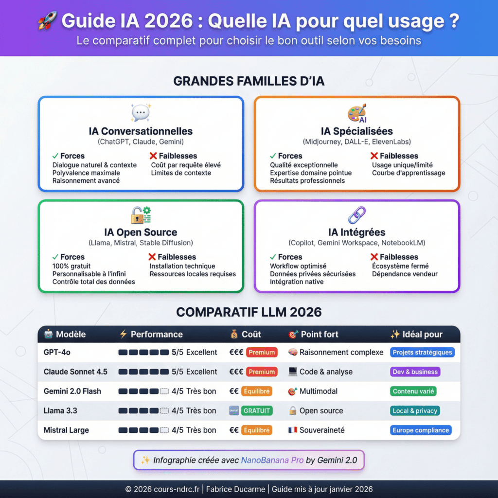 La question revient partout en 2026 : « Quelle IA utiliser pour quel usage ? ». Entre ChatGPT, Gemini, Claude, Mistral, Midjourney, DALL·E et Runway, il devient essentiel de savoir choisir l’outil adapté. Ce guide complet analyse les forces, faiblesses et usages concrets des principales IA pour vous aider à faire les bons choix professionnels et pédagogiques.